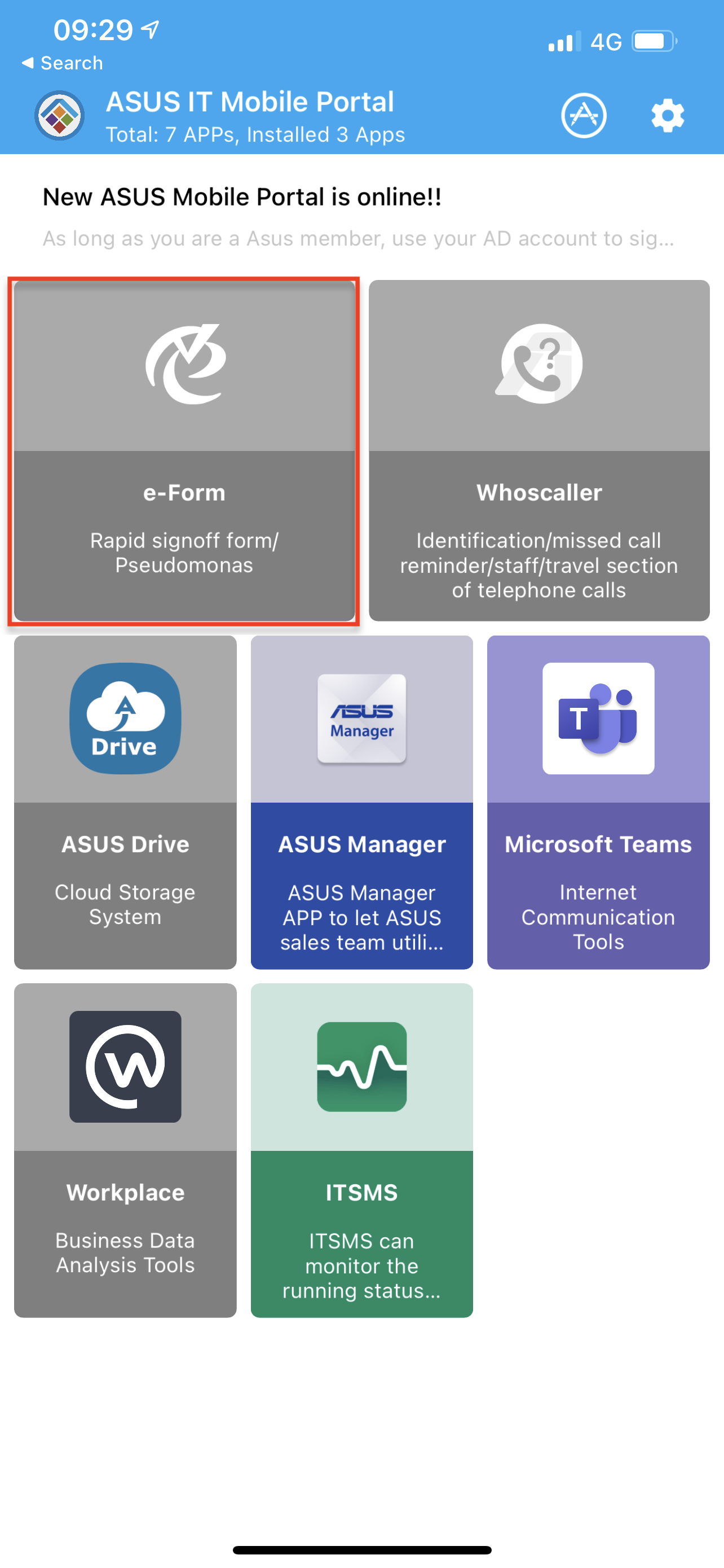 確認您的手機已連線網路。如您未安裝過ASUS IT Mobile Portal,請務必先安裝,才可透過它安裝eForm APP(iOS)。