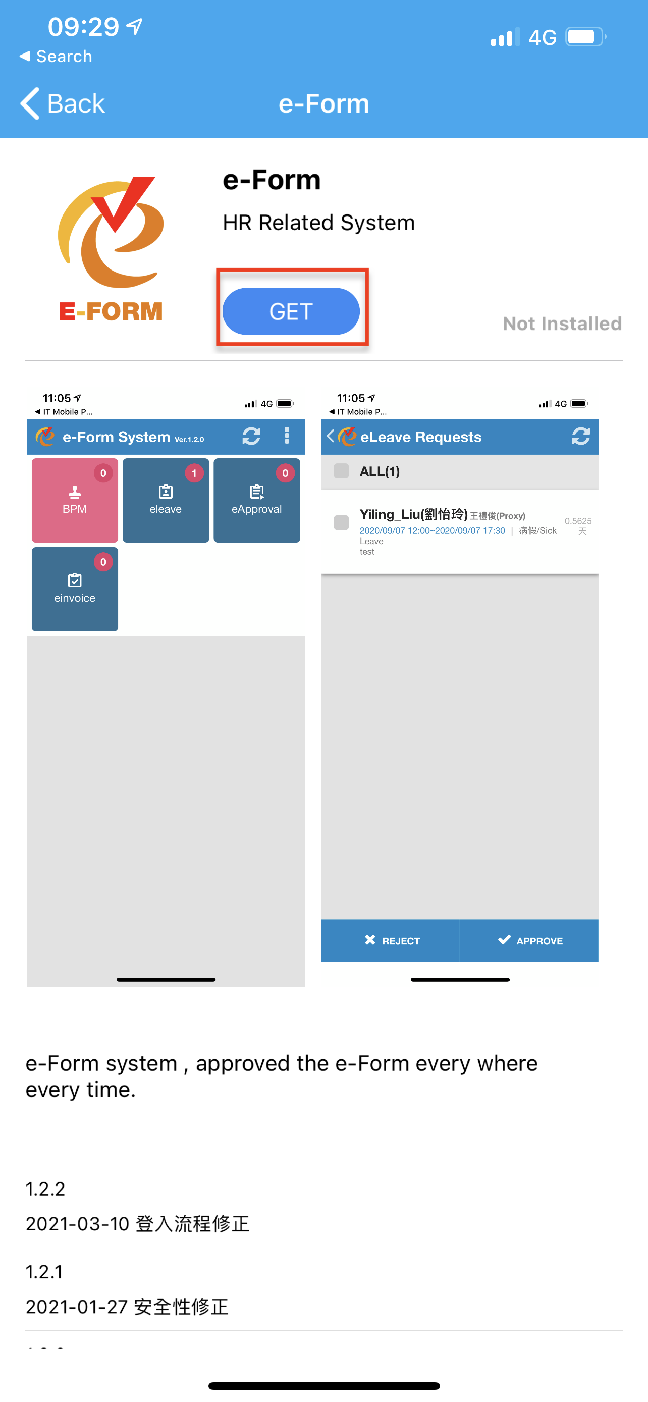 開啓您已安裝的IT Mobile Portal App,點擊eForm圖標進入App介紹內頁。