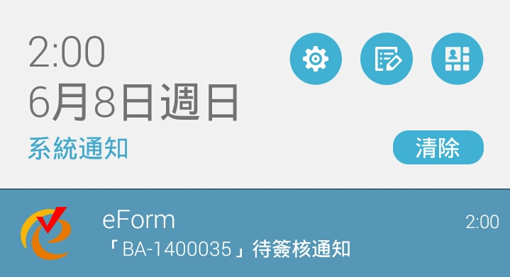 如您有待簽核的表單(BPM/假單),都將會於Android 通知欄上即時顯示提醒您,手勢從上向下滑即可查看通知內容。